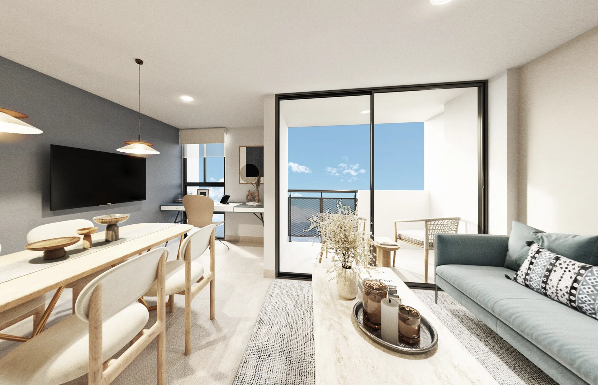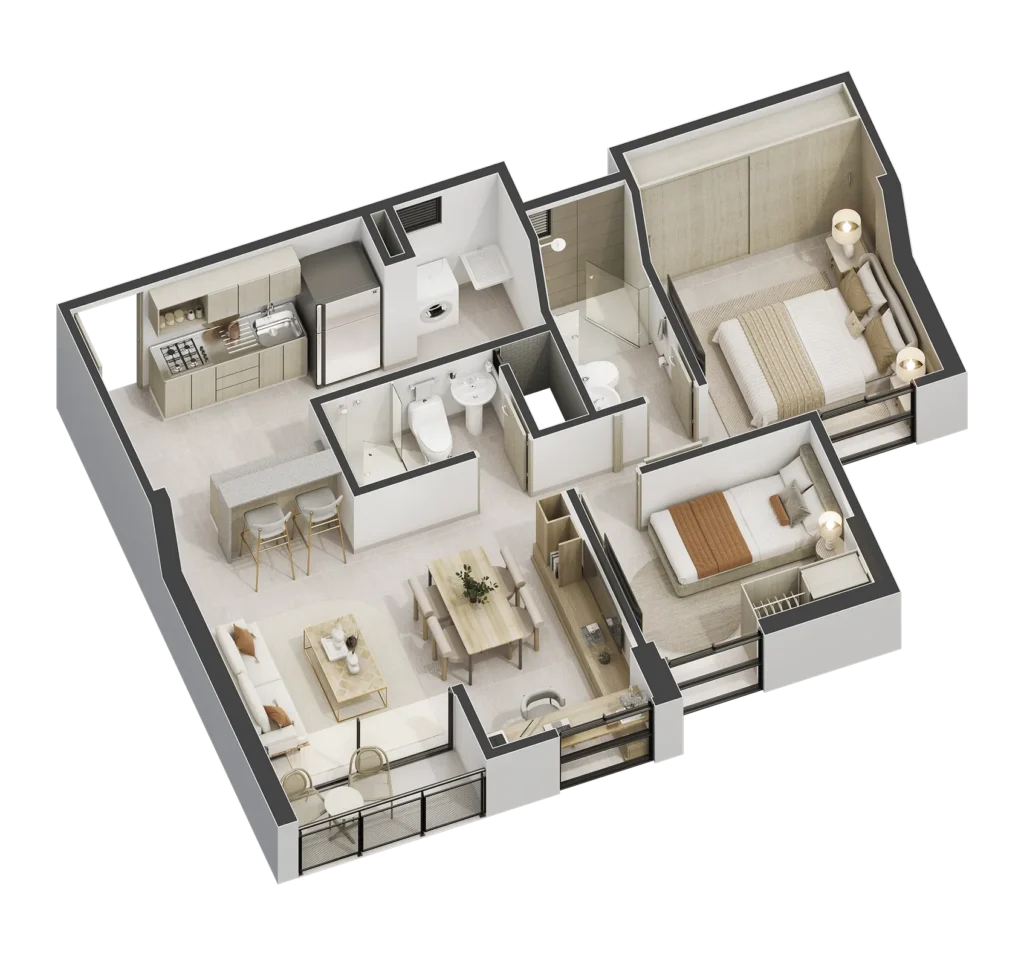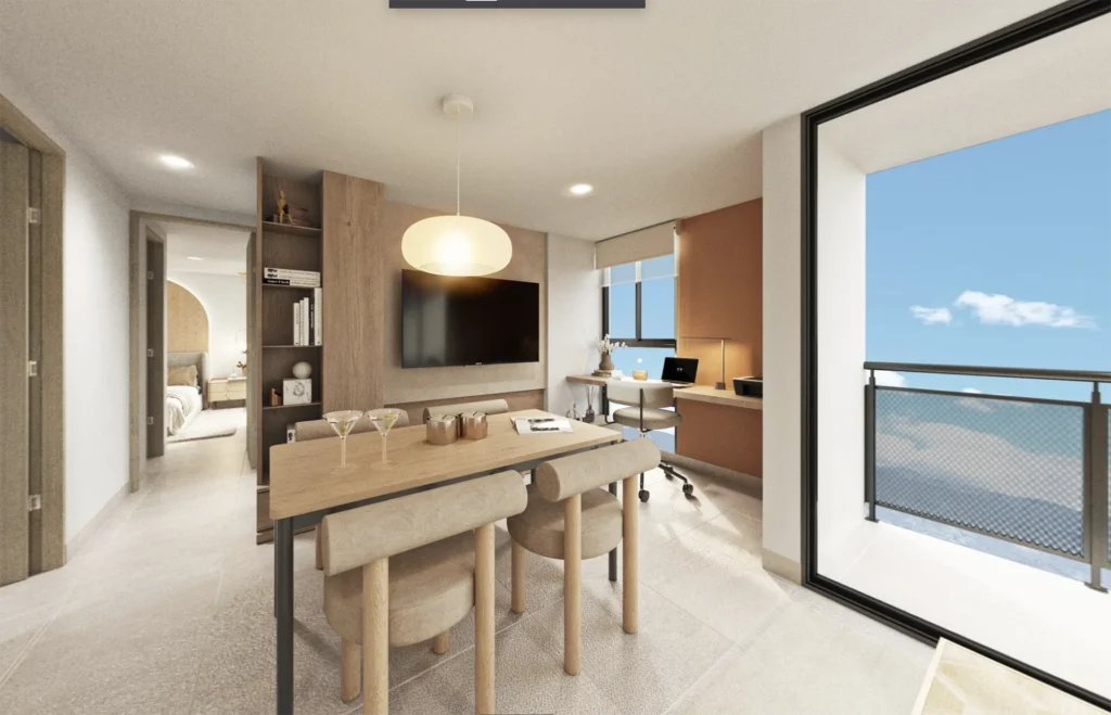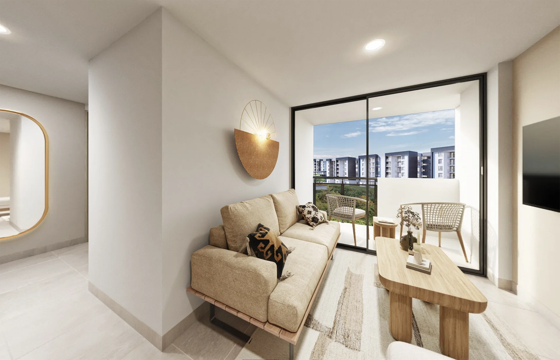 El proyecto ofrece dos tipos de apartamentos, con una característica especial: un espacio flexible que puede adaptarse fácilmente según tus necesidades, ya sea como una alcoba adicional o como un área social más amplia.