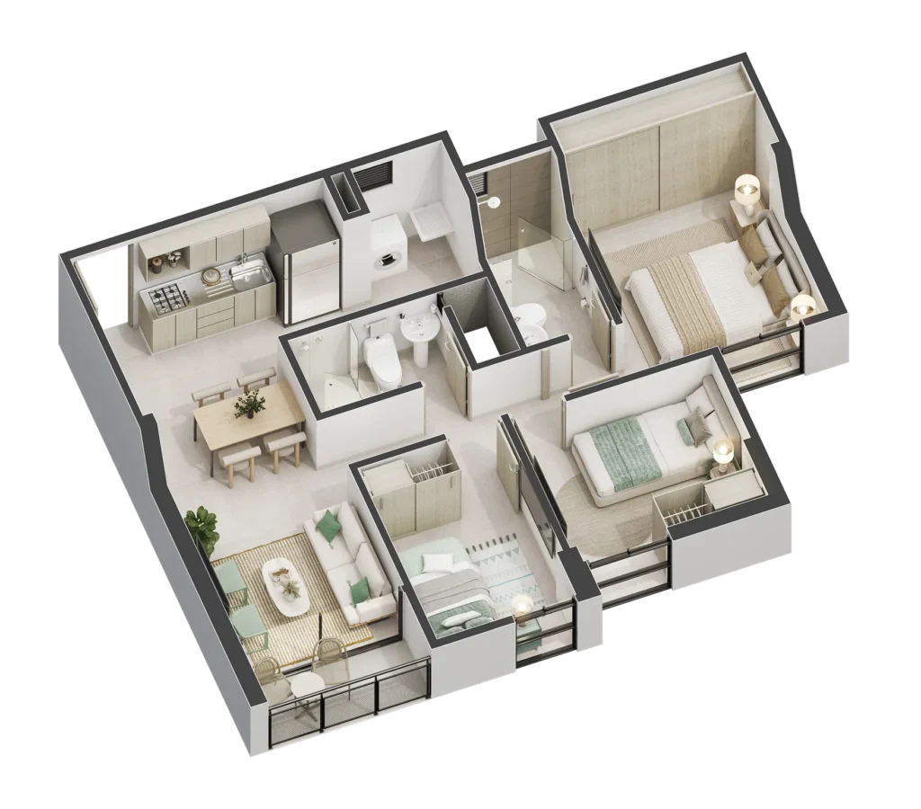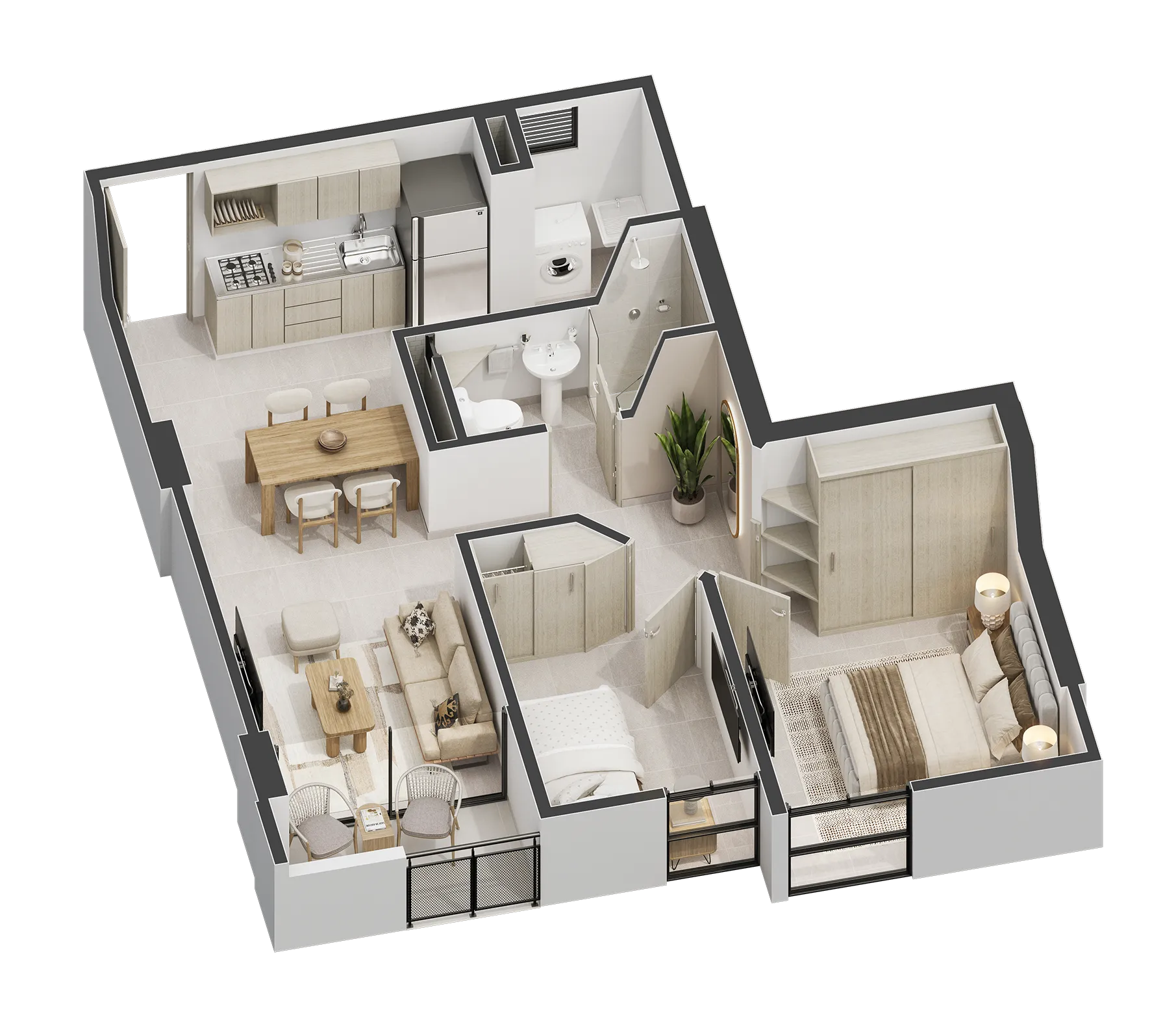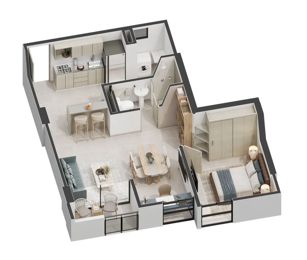 El proyecto ofrece dos tipos de apartamentos, con una característica especial: un espacio flexible que puede adaptarse fácilmente según tus necesidades, ya sea como una alcoba adicional o como un área social más amplia.